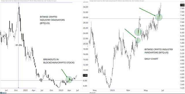 For the second chart, let’s check in on the crypto space via the Bitwise Crypto Innovators (BITQ:us) ETF. Given the strength in the Bitcoin market in 2023, the securities of the various crypto miners have been coming to life and the chart below shows the same ETF, with the weekly chart on the left and the daily chart on the right. I just covered this in the #WhereDoWeStand webinar today (June 30th, 2023), but a weekly breakout is more important than a daily breakout and seeing daily higher highs and higher lows is evidence of the breakout working. I’d encourage us to keep an eye on this space, especially as the likes of Blackrock, Fidelity and other large institutions seek new approvals for ETFs and ways to introduce their institutional friends and clients.
