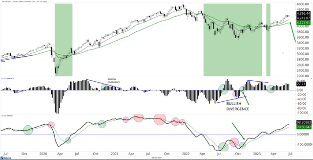 We’ve had more evidence of rotation as I write this and rotation is good! Rotation is healthy! Seeing areas like the industrials sector appear with very robust strength and now the materials sector waking up are more positives for this market. Cruise lines, airlines, specialty retailer stocks are moving and these are economically sensitive sectors and more bullish evidence for the overall bigger picture. The distance between the 13-week average and the 34-week average (green arrow) is growing as evidence that the trend has been strengthening.