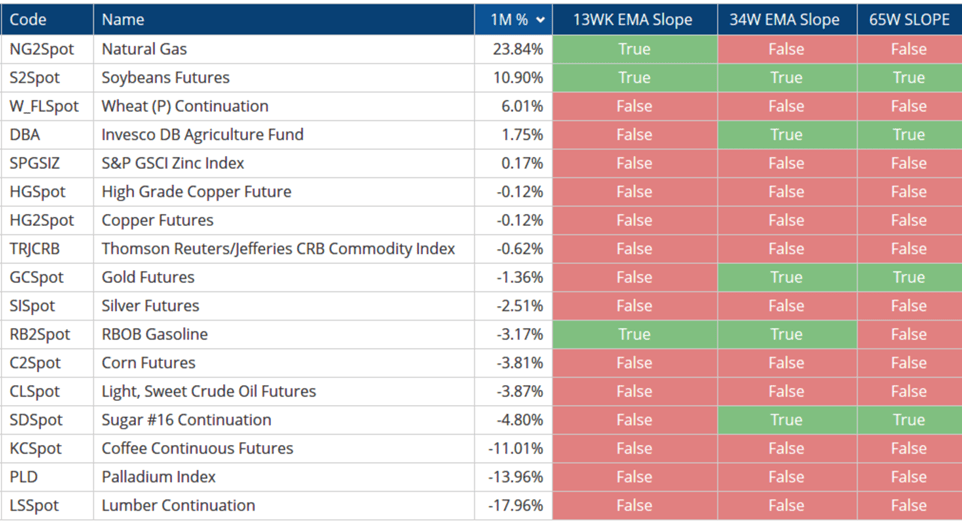For the most part, we still have weak commodities. I don’t see this as a reason to not pay attention, in fact, there are a few technical reasons, I think we should be keeping a close eye on the commodity space. In the last month, natural gas is +23.8%, but that is in the context of a savage -75% crash from its highs last year, so certainly not particularly exciting in bigger picture context. Most of the trends remain down as you can see given the 13-week moving average slopes, the intermediate-term 34-week slopes and the longer-term 65-week slopes are all showing “false” which means falling.