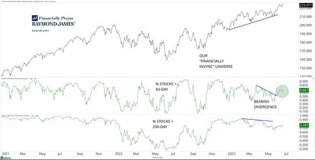 Last month, I showed the breadth deterioration of the #INsync universe with the % stocks > 50-day and % stocks > 200-day deteriorating and offering up a bearish divergence with lower highs, even as the universe itself went higher. But now we’re seeing recovery (green circle below) as some of the stocks that were underperforming like the truckers (part of transports) come back to life. This is a normal and healthy part of stock market behavior. Remember, rotation is good!