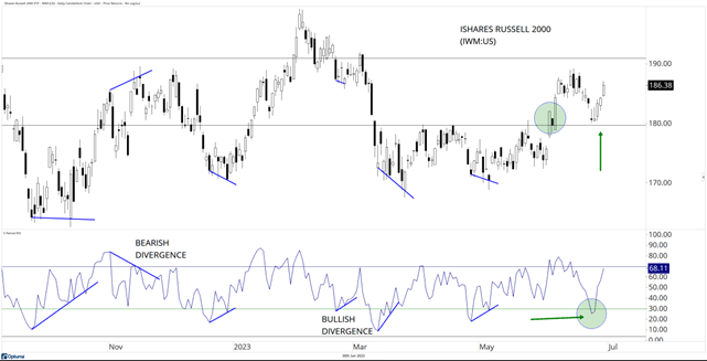 Let’s check in on the small-caps. In early June, we had an impulsive looking move up on volume in the small, mid and micro-cap space, which is evidence of some more broadly based buy programs. In the chart below, you can see that the buying (green circle) occurred as the price of the Russell 2000 (IWM:us) moved out of a multi-month base and went higher. Then, it pulled back in a short-term correction reaching RSI(5) oversold (lower panel) and has now bounced nicely (green arrow). Could this short-term action in recent months turn into an intermediate-term opportunity in small caps? Sure thing. But work to do. First we have to clear those highs from the recent month, and then clear those 2023 highs, so let’s not get ahead of ourselves. But small-caps have been very out of favour, so from a contrarian standpoint I thought deserved some attention.