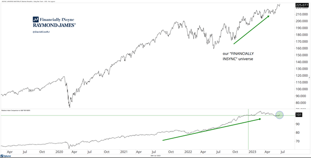 Just like the broader markets, our “Financially INsync” universe is in an uptrend. As the market has experienced more underneath rotation, our universe went through a period of marginal underperformance vs. the market in the past quarter, but has just started to turn upwards again (green circle). This being a quarter-end, we will be re-screening our universe and that is rather exciting! We get to see which stocks meet the rigid screening criteria and which have fallen away. I will of course keep you posted on any notable developments!