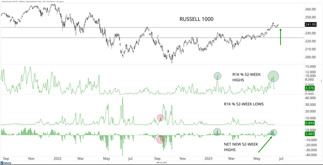 The first chart this month is the Russell 1000, a broad based index with 1000 stocks. In the chart below, we can see the index itself getting back above those summer ’22 highs, and that’s a great technical level that should now offer some support. But underneath, you can see that there are a greater and growing % of stocks hitting new 52-week highs and an absence of stocks hitting 52-week lows. The bottom panel shows the difference between the two and we can simply acknowledge that more highs than lows is bullish and what we want to see as investors.