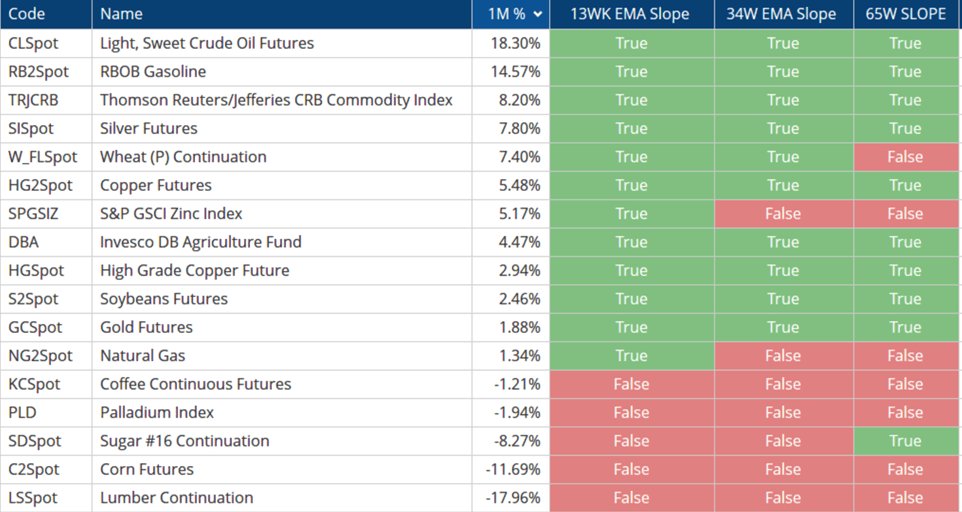 Lots of improvement with commodities this month as the amount of green on the table below has grown considerably in the past month. Oil led the gains with a +18.3% gain in the last month and gasoline +14.6% is not that far behind. This of course presents potential problems for these central banks who have been thankful that CPI (inflation) numbers have been falling but I remind you that there are formulaic reasons for such activity and the U.S. particularly made a change in early 2023 to manufacture today’s declines. Let’s keep a close eye on commodity prices and we’ve all likely noticed that gasoline prices are rising again, though in summer, that’s seasonally typical.