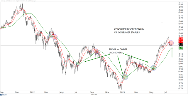 For the first chart, I’m going to show the consumer discretionary vs. consumer staples chart, as I mentioned above, which has crossed short-term bearish 8/20EMA (red circle). As you can see though, this relationship is not only above the breakout levels of the fall 2022 highs, but has a clear 2023 uptrend in progress. Discretionary stocks which include cruise lines, homebuilders, automobiles, hotels and retail type stocks are related to consumer spending and economic prospects and when discretionary areas outperform the more defensive consumer staples (think grocery stores and food companies), they demonstrate investor penchant for risk taking.