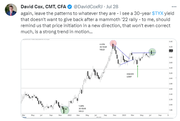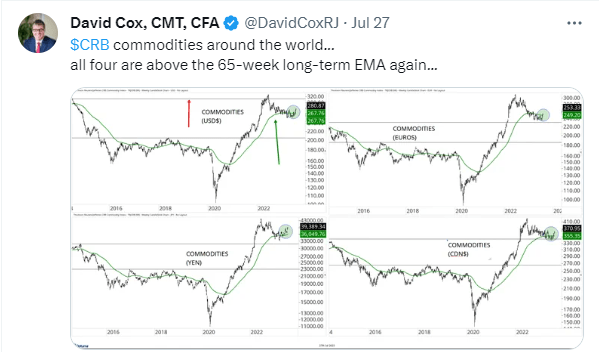 The lagging Toronto stock market and emerging markets (see “David’s Contrarian Corner”) have even risen this month. The TSX is not in an uptrend, but has bounced along with other equity assets in July. Commodities have turned upwards with rising 13/34-week moving averages and are back above the 200-day moving average as crude oil and gasoline both moved up sharply. It’s really just bonds that continue to struggle, as central banks further continue to raise interest rates and demand from bond owners has been unable to overcome supply as 10-year and 30-year yields remain very elevated after the 2022 rally.