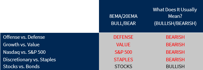 The “Relatively Speaking” table (above) this month serves as a useful lesson on time frame. The market has been acting bullishly, without question, and continues to do so in both the intermediate and long-term time frames. But the table above refers to, and monitors the short-term trend as defined by the technical balance between the 8 and 20-day exponential moving averages. In the short-term, we’ve had a very mild dip against the long-term uptrend. Each of offense vs. defense, growth vs. value, NASDAQ vs. S&P 500 and discretionary vs. staples have crossed over bearishly, but ALL are in uptrends bigger picture. I see no reason for concern with these changes, just an acknowledgement of the short-term dip against the long-term trend. And perhaps more importantly, evidence that the market is broadening out further.