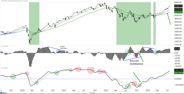 The S&P 500 has continued to rise steadily along with a rising #MACD histogram as the 13-week and 34-week averages become further apart. This happens as the short-term trend leads the intermediate-term trend as has been the case for much of 2023.
