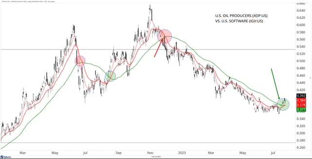 For the second chart, let’s look at the U.S. oil producer stocks vs. software stocks. This is sort of a proxy for value vs. growth. The energy stocks had a huge year in 2022, but have been largely weak since and certainly underperforming technology stocks, but…. Here’s the short-term (8/20EMA) and the intermediate-term (20EMA/50SMA) moving averages crossing. Sure, it’s not a higher highs, higher lows relative trend yet, but it’s the start of some outperformance. An investor should then turn to the absolute charts of stocks and/or ETFs in the energy space to better gauge opportunities that might exist.