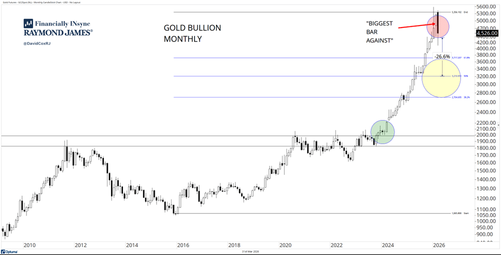 On a big picture basis, gold remains in an uptrend, but the recent price activity since late January to me looks like distribution and leads me to conclude that gold just peaked. Before jumping to conclusions, am I saying that gold has to fall all the way down to the level of years ago and erase all the gains that have been? No! But when gold really broke out in early 2024 and moved above the $2,000 USD level, it went up significantly rising to more than $5,500 in just more than two years. It has since fallen almost $1,000 from those highs and is set to finish the month of March with the “biggest bar against” and a bearish engulfing candlestick.