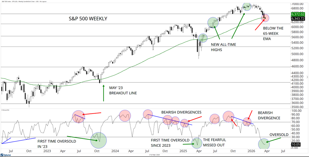 For the first time since last year (remember the “Tariff Tantrum”?) or the so called “Liberation Day” period last spring? Markets fell swiftly and strongly and somewhat similarly have been falling this time around and are now sitting “oversold” (lower panel). This typically happens once a year, but this does not mean that we can buy with 100% certainty. Stock markets are volatile and can be subject to corrections, selloffs and/or bear markets, which can take place through price or time. We haven’t had a protracted bear market since 2022, is it time? At this point, we have the S&P 500 sitting down against my big picture 65-week exponential moving average (green) and still have higher highs and higher lows, BUT, the monthly chart does show some wear and tear and some considerable selling which at this juncture looks a little more heavy than it did last year. Add to that the passage of time (the bull market is in its fourth year) and you find me being more cautious as we evaluate our current conditions.