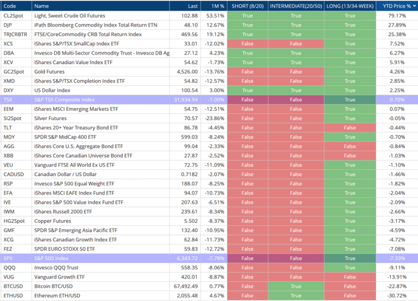 Our “all asset” table, which is designed to be an overview containing assets from stocks to bonds to commodities and from east to west, shows our current environment well. We are in the midst of long-term uptrends (note the green/”true” in most cases), but have turned short and intermediate-term negative as markets have fallen, most recently since the Venezuela and then Iran war has begun.