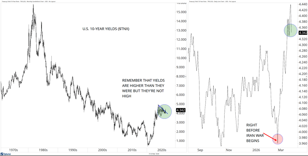 Many of you remember the 1980s and the high cost of home mortgages, the seemingly generous rates on GICs/CDs and in those days, the interest that the banks paid us for trusting them with our money (those days are long gone!). On the chart below (left), we have the 60-year chart of U.S. 10-year yields ($TNX) and on the right side is the zoomed in version of past 7 months and you can see that we’ve gone from ~3.95% in late February to ~4.3% today as I write this. The media will tell us to blame Iran, or rising oil prices or Trump or Israel, but the reality is that in 2020 rates bottomed after declining for 40-years and a radical new environment was ushered in. Instead of complaining, let’s consider its implications on our investment portfolios, our financial assets and liabilities and adapt instead of pointing fingers.